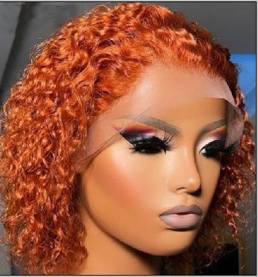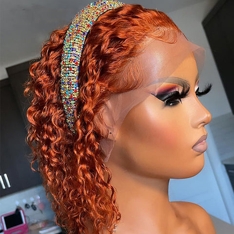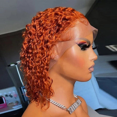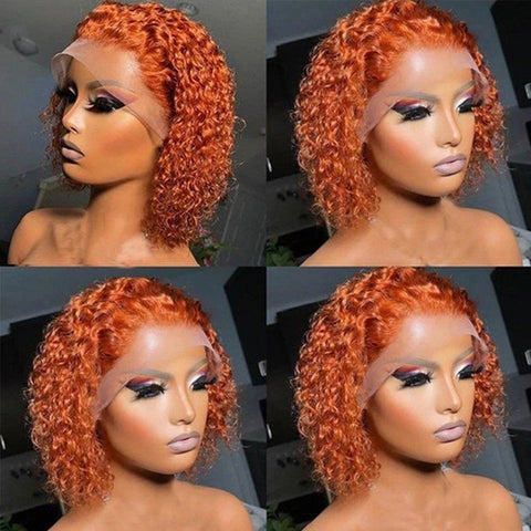 Orange Ginger Color Bob Curly Wig Human Hair Lace Frontal Wig 180% Density Transparent Lace Wigs